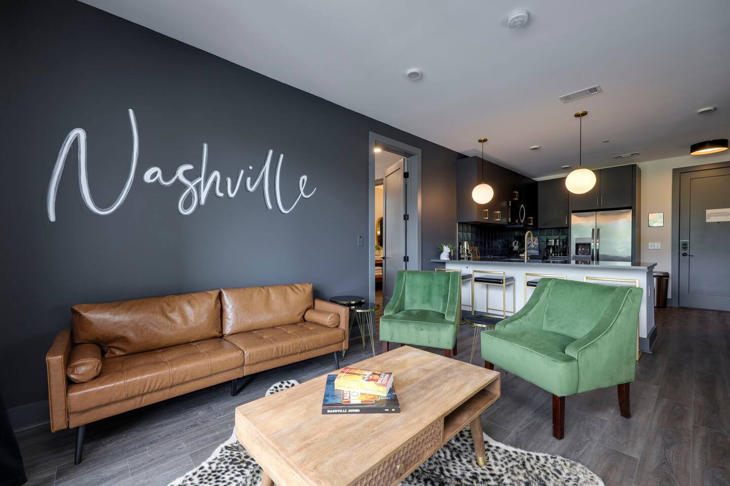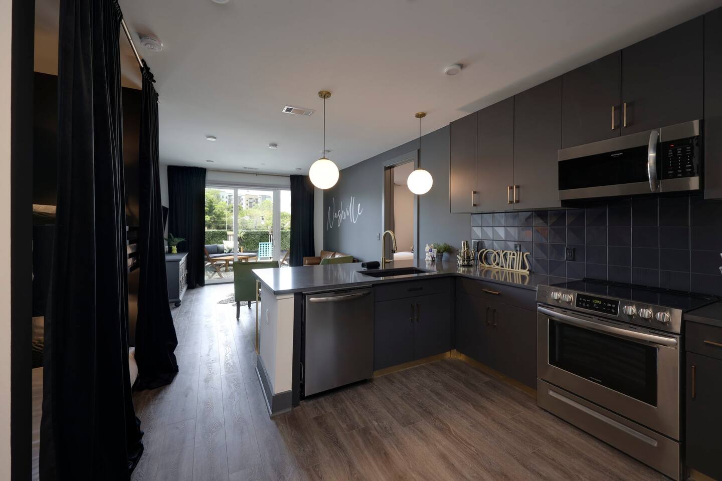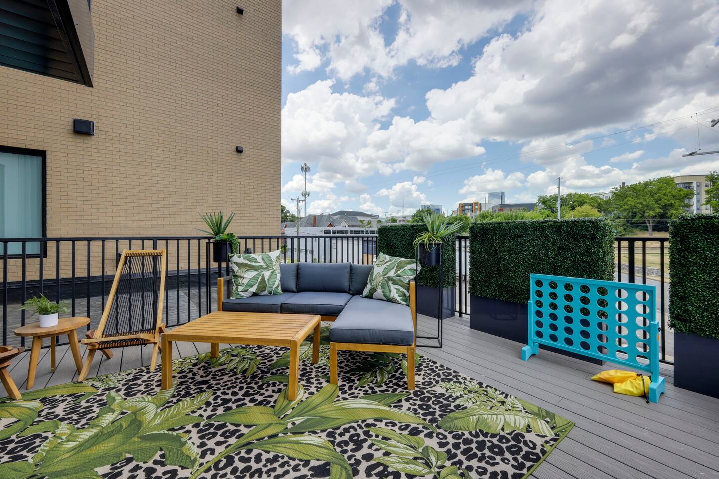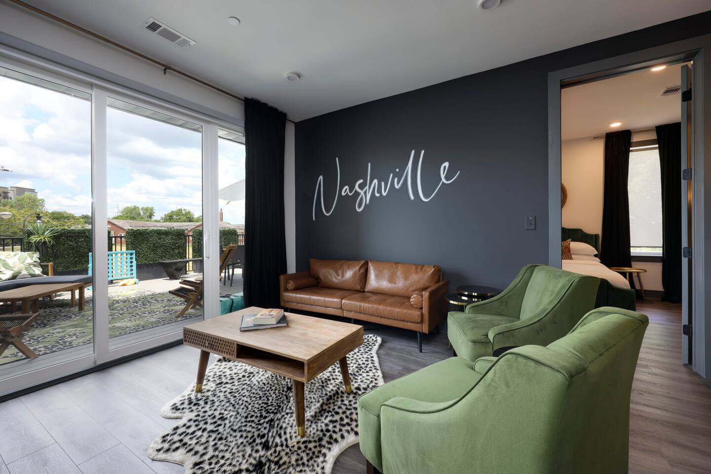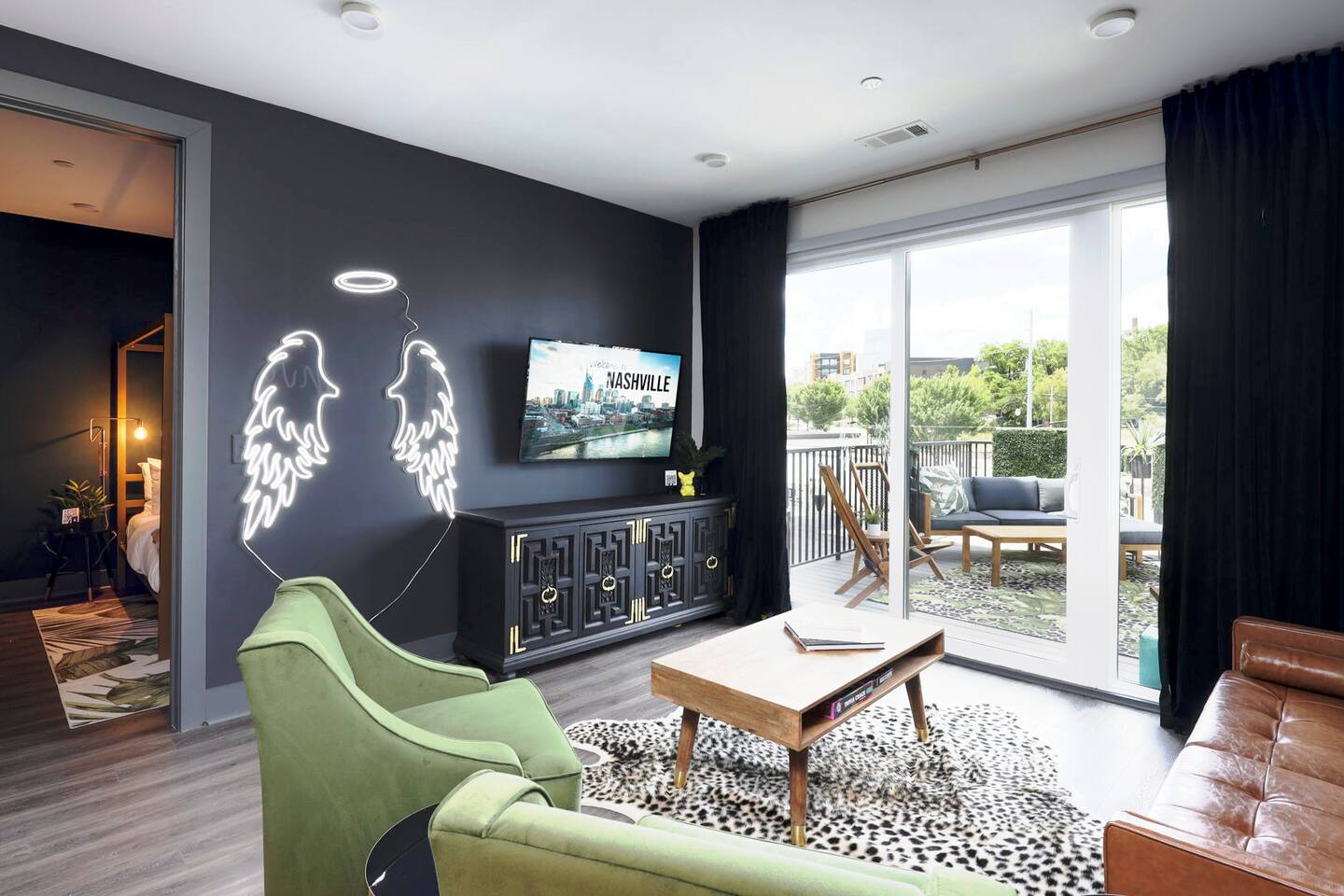 Nashvilleurbanretreats presents this spacious 2 bed 2 bath, which was designed by Nashville's best designer. Sliding doors lead to the largest outdoor deck with grill in this elevator building. The deck has a curated space for outdoor dining and entertainment with a few fun outdoor games to loosen up before heading out to downtown Nashville, which is a 15-20 min walk. Have some fun posing in front of a mural done by one of our favorite Nashville muralists as well as the cool neon angel wings.