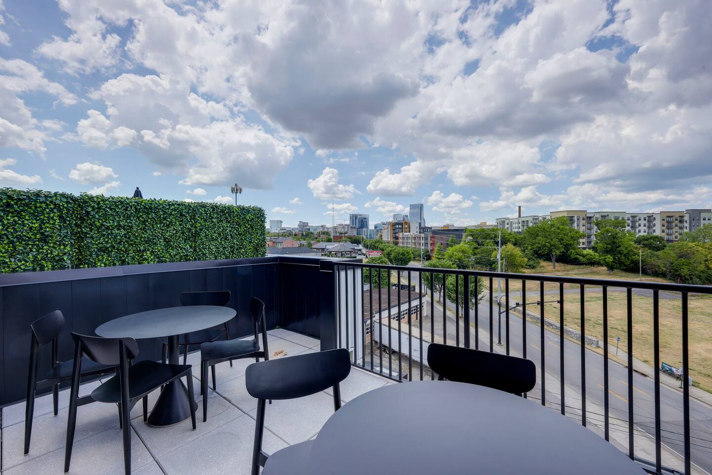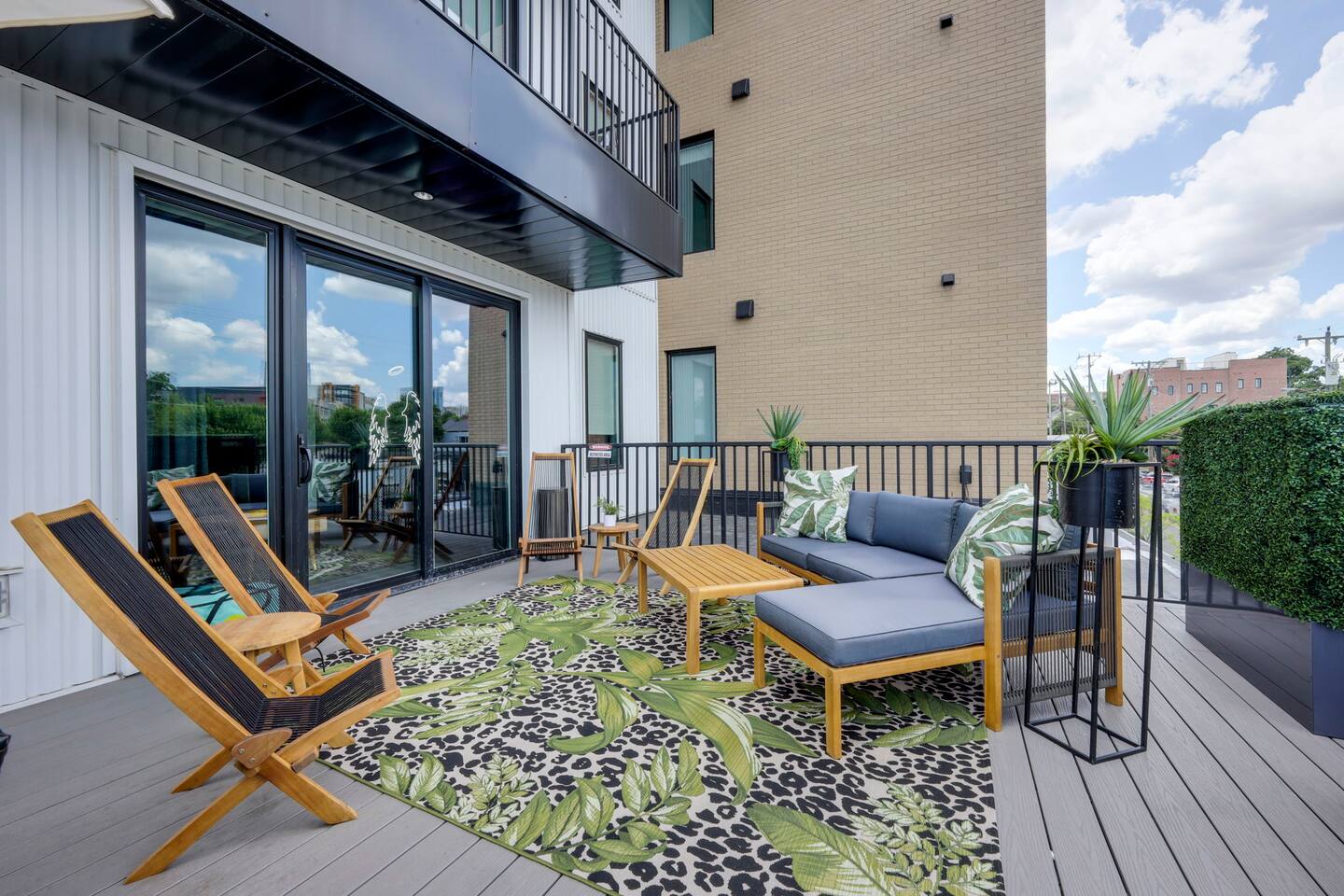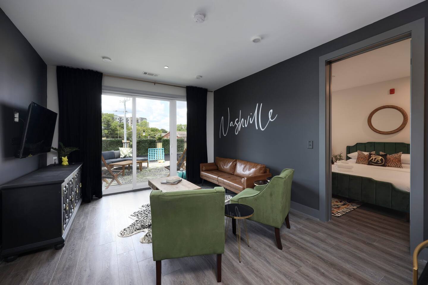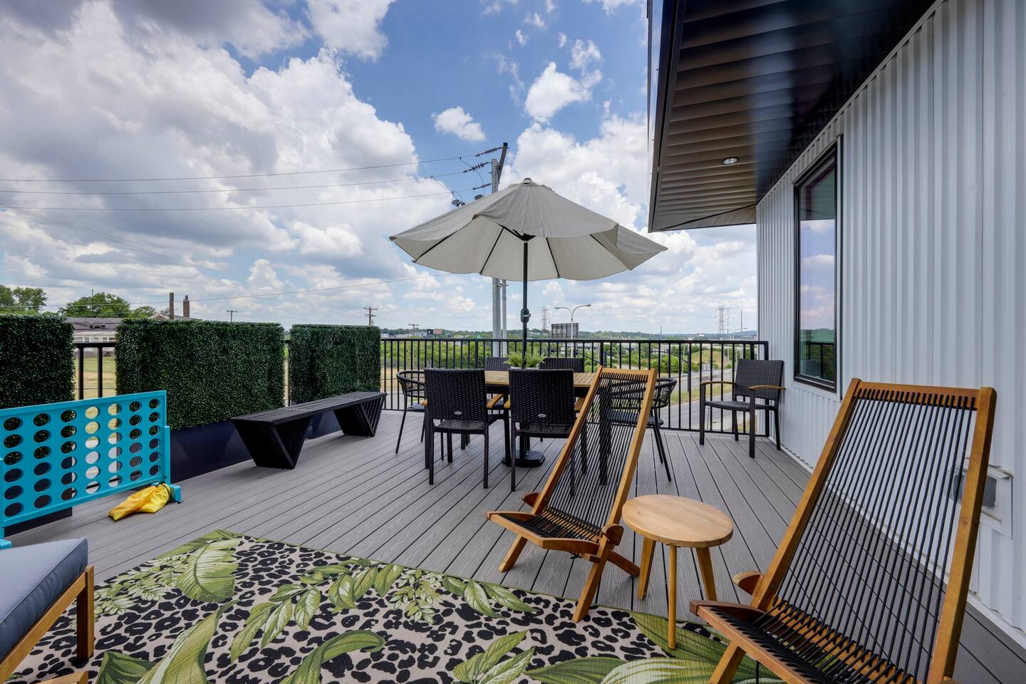 Nashvilleurbanretreats presents this spacious 2 bed 2 bath, which was designed by Nashville's best designer. Sliding doors lead to the largest outdoor deck with grill in this elevator building. The deck has a curated space for outdoor dining and entertainment with a few fun outdoor games to loosen up before heading out to downtown Nashville, which is a 15-20 min walk. Have some fun posing in front of a mural done by one of our favorite Nashville muralists as well as the cool neon angel wings.