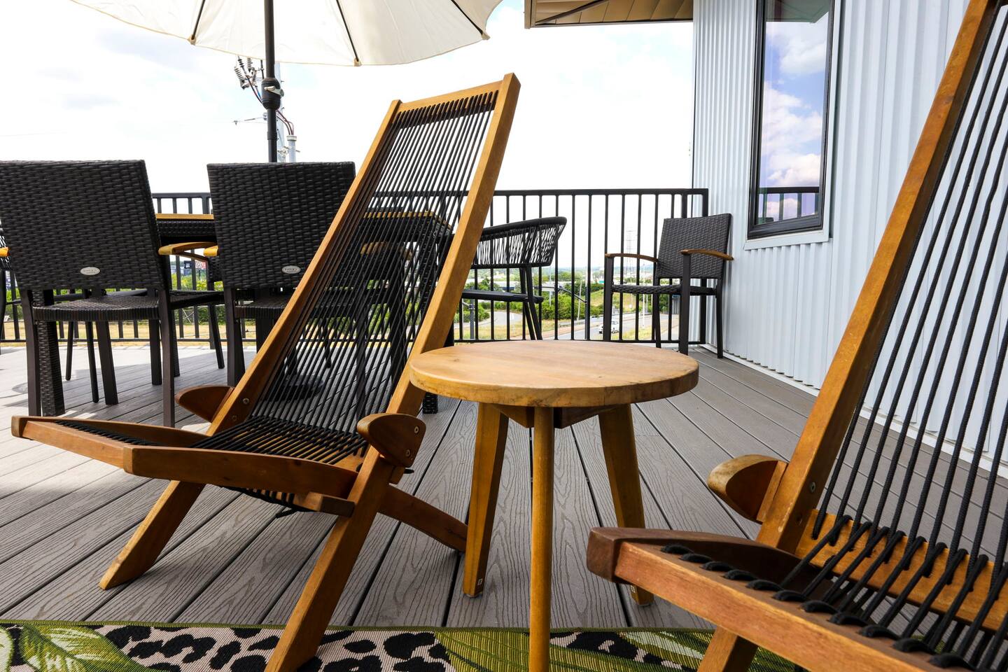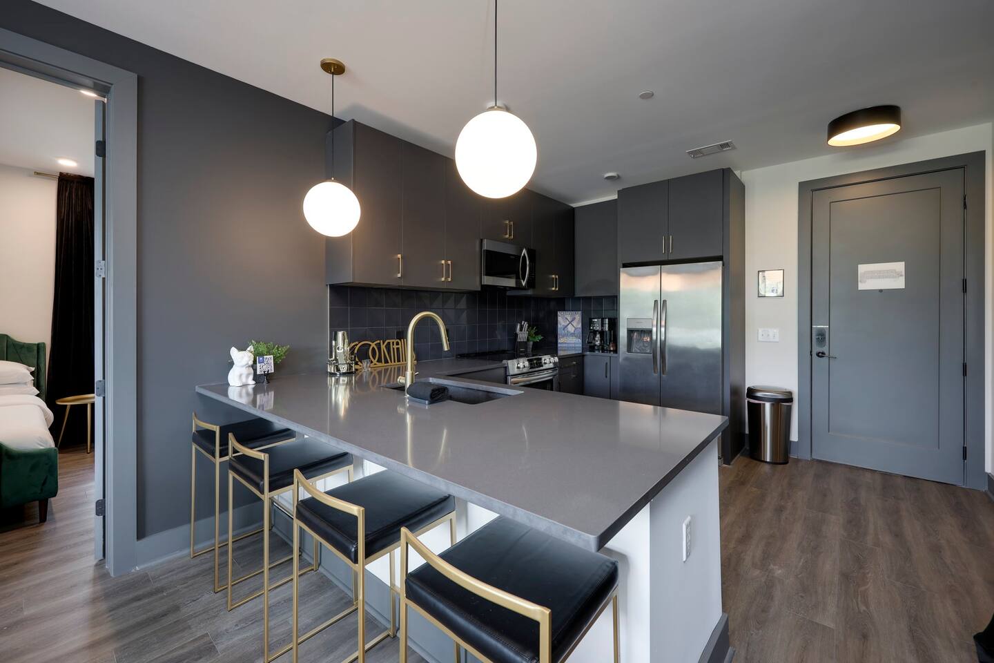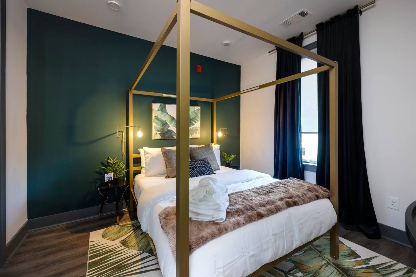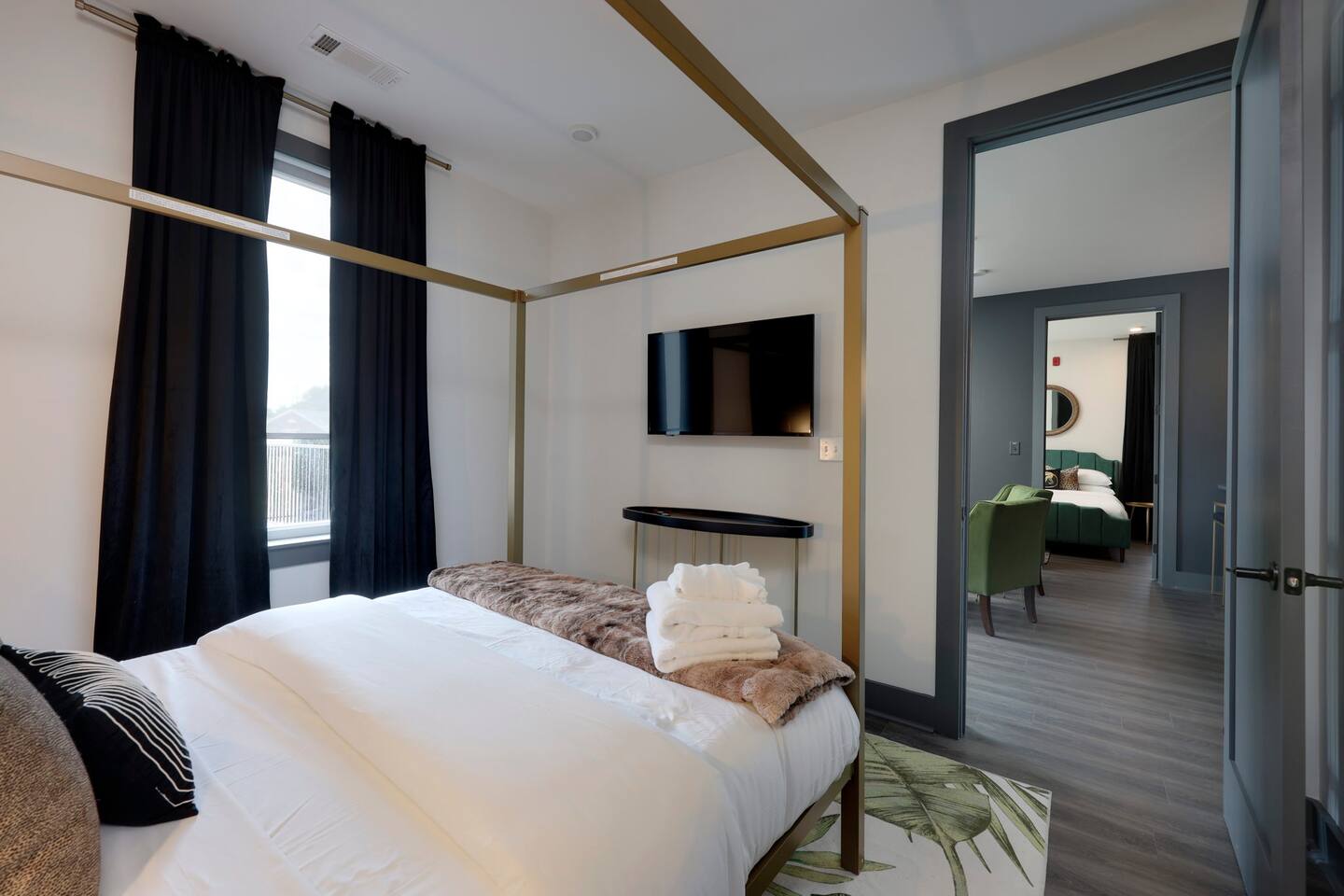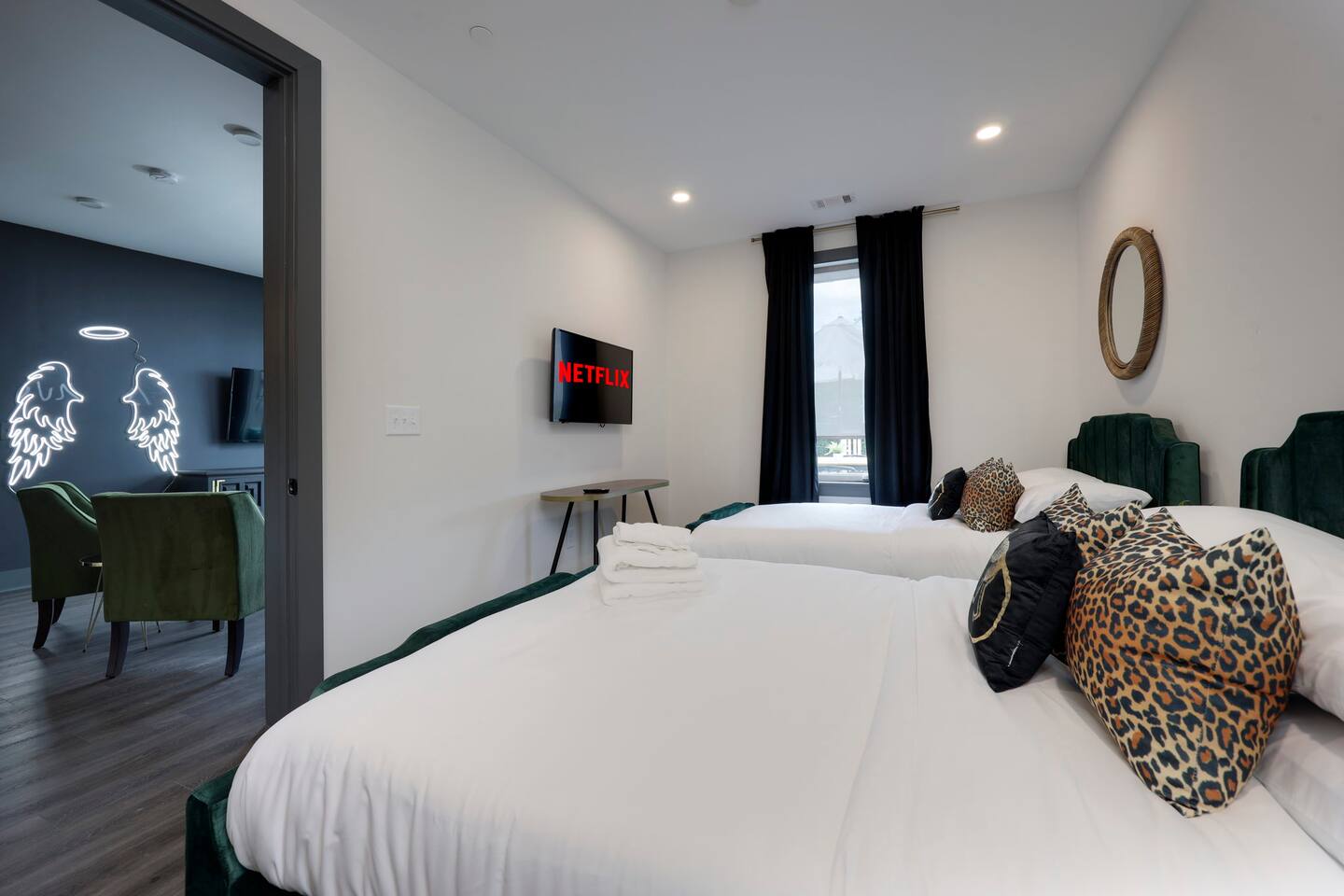 Nashvilleurbanretreats presents this spacious 2 bed 2 bath, which was designed by Nashville's best designer. Sliding doors lead to the largest outdoor deck with grill in this elevator building. The deck has a curated space for outdoor dining and entertainment with a few fun outdoor games to loosen up before heading out to downtown Nashville, which is a 15-20 min walk. Have some fun posing in front of a mural done by one of our favorite Nashville muralists as well as the cool neon angel wings.