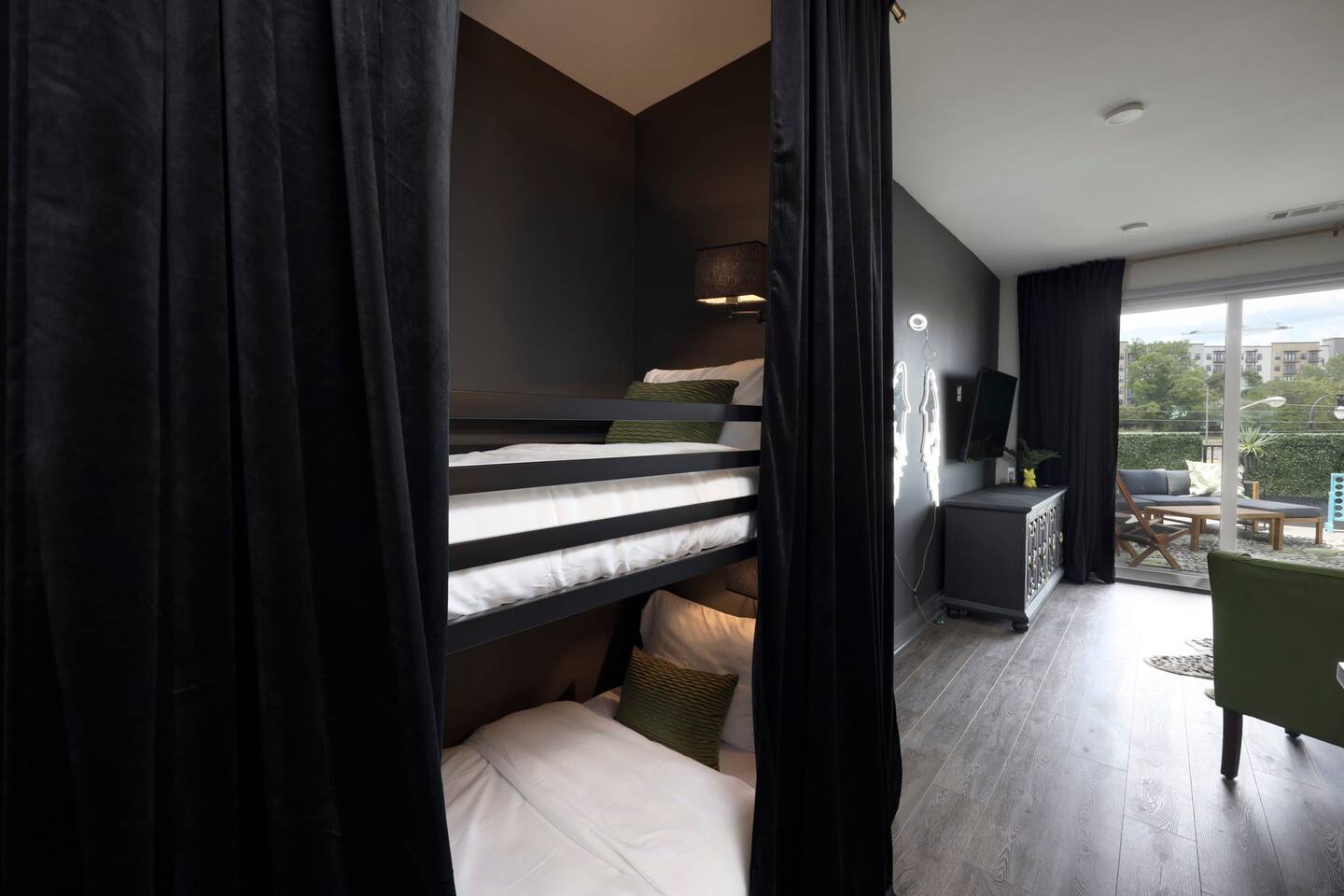 The apartment has everything you need with full kitchen and living areas, an outdoor patio/balcony, and two bedrooms each with private bathrooms and closets. There is a nook in the living room with a bunk bed. There are stainless steel appliances, basic cookware if you plan to cook, and a Keurig for that morning coffee. The apartment also has a tv in the living room and in each of the bedrooms, free wifi, and white noise machines for a sound night of sleep.